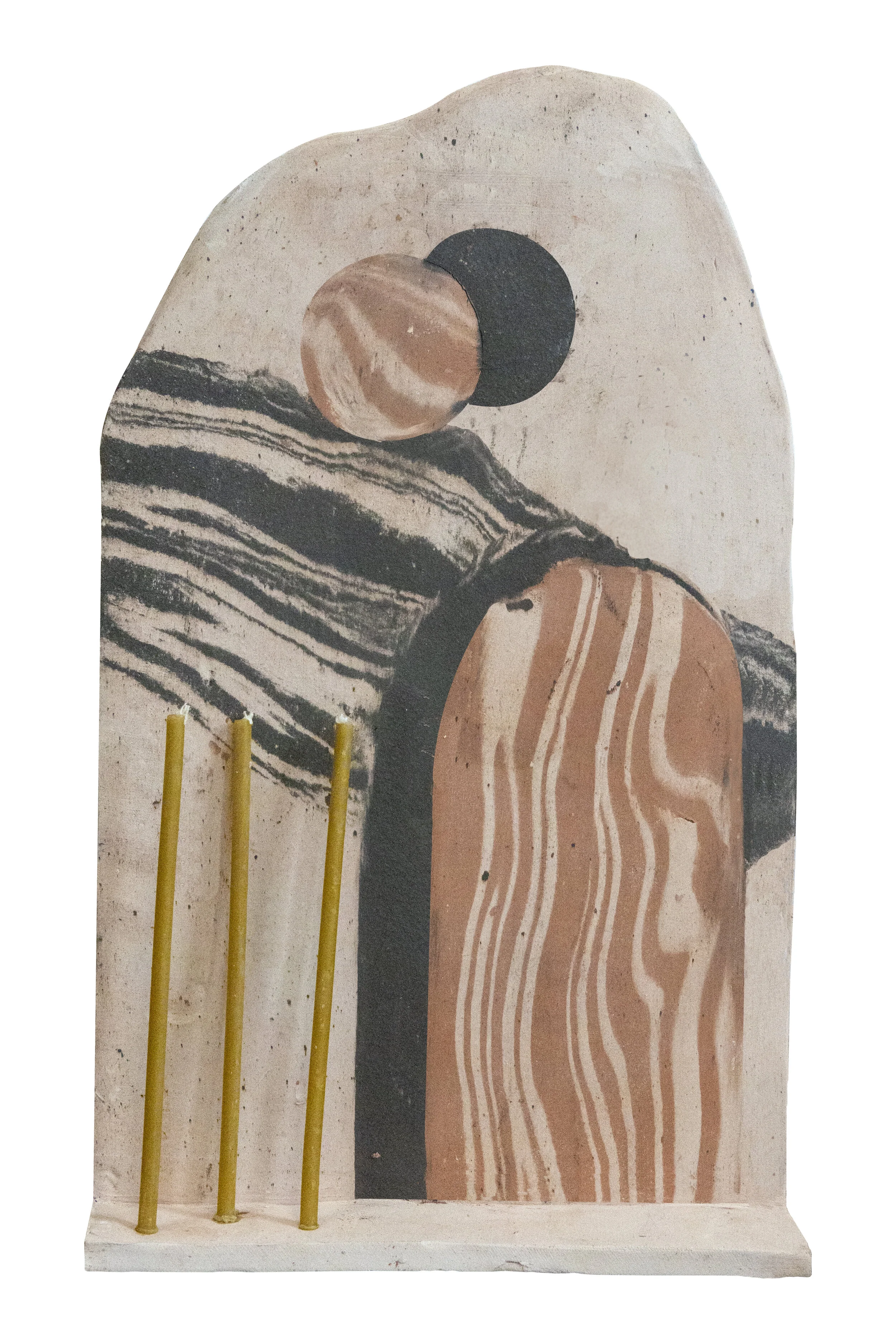 This unique stoneware piece by Nastassja Simensky has been inlaid with stained clays, and comes with a wall fixing and 6 beeswax taper candles. Size 38 x 24cm.