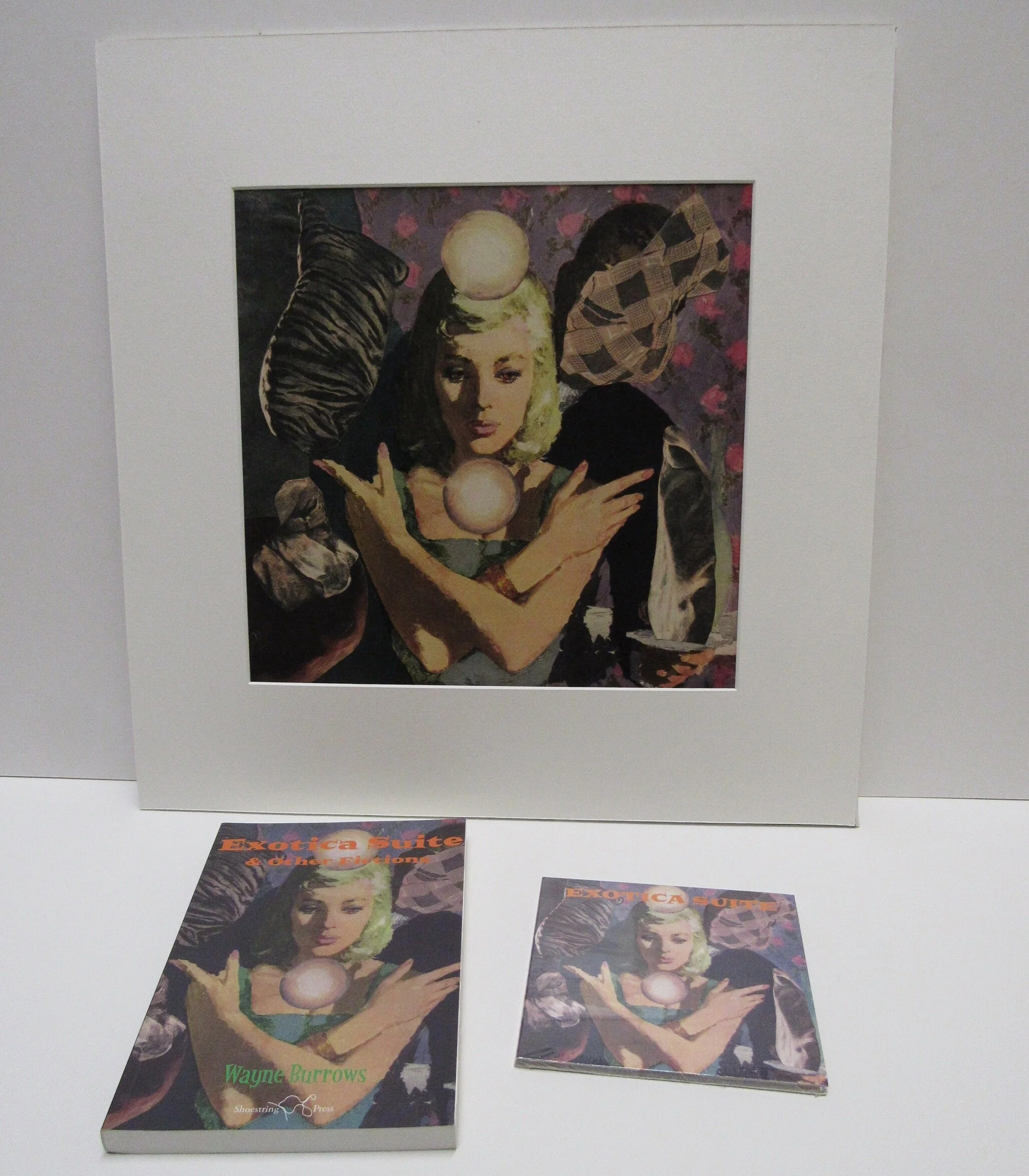 This bundle by artist Wayne Burrows includes a copy of the 'Exotica Suite' book and CD, made in 2015 in collaboration with Paul Isherwood (The Soundcarriers), along with the unique original collage cover artwork ('The Sorceress'), mounted ready for framing, approx. size 45x45cm.
