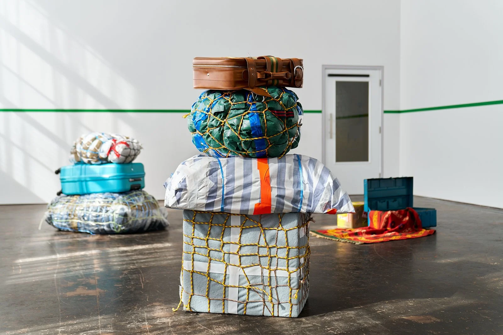 In Gallery 1, the five new sculptures that Lee will make at Primary will become part of her Bondage Baggage (2018 – present) series. The sculptures are intricate prototypes of luggage seen arriving at the Kathmandu International Airport, often owned by Nepali migrant labour workers from the Middle East, South and East Asia. They are often wrapped and bound in quotidian materials: cardboard, rope, textiles, and tape. The luggage is bound in ways that are difficult to tamper with, concealed and enforced by techniques that are characteristically unique. The masking of its contents would pose a threat to any Western standards of security measures and customs—the hand-woven luggage becomes remarkable objects that are, by design, an embodiment of anti-establishment and anti-imperial gestures. Blending the installation with traditions of public offerings, as seen in Korean jesa or at religious sites such as Buddhist monasteries within Nepal, Primary and Lee will invite our community to present luggage and other personal offerings alongside her sculptures.