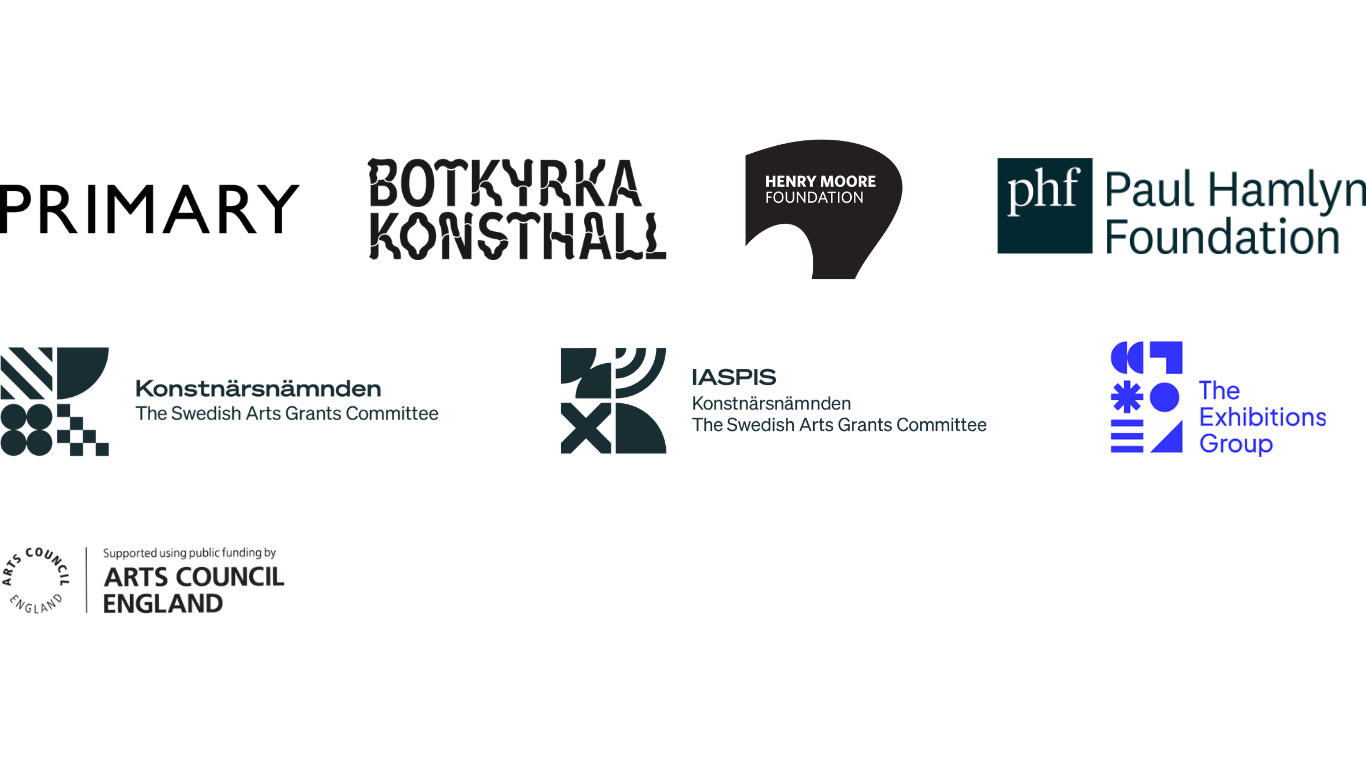 The exhibition was made possible by the generous support of the Henry Moore Foundation, the Paul Hamlyn Foundation, Arts Council England; IASPIS, Konstnärsnämnden, Internationellt utbyte och resebidrag (International exchanges and travel grants); Konstnärsnämnden, the Swedish Arts Grants Committee; and The Exhibitions Group. Adam Seid Tahir and Amina Seid Tahir’s new work from att gräva fram solen (to unearth the sun) is co-commissioned by Botkyrka Konsthall with Primary.